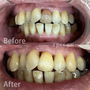 「急に歯が変色したので白くして欲しい」ということでご来院いただきました。ウォーキングブリーチ治療で現状よりも白さを取り戻すことができました。